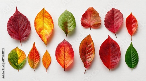 Obraz premium Bright autumn leaves in shades of red yellow and green create a captivating display on white.