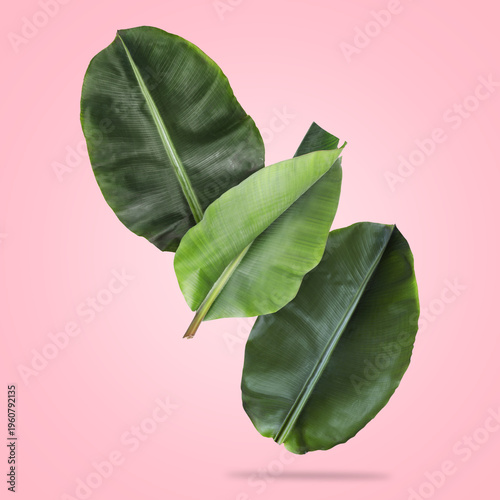 © New Africa, Fototapeta premium Bright banana leaves falling on pink background