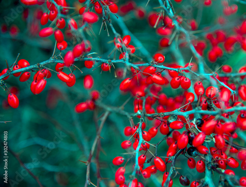 © FO_DE, Obraz premium Bright barberry branches with red berries on a blurred background