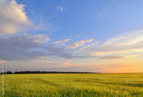 Fototapeta premium Bright barley field under a summer sunset sky