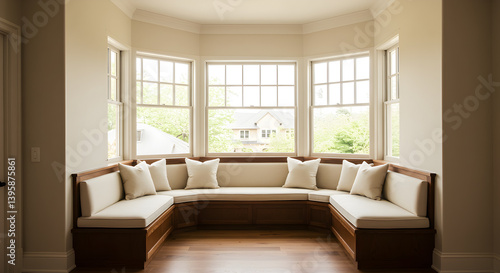 © ANDRE, Fototapeta premium Bright Bay Window Seating Area With Built In Bench And Pillows