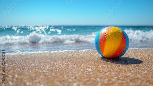 Obraz premium Bright beach ball resting on sandy shore with ocean waves and clouds in the...