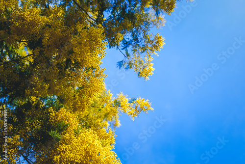 Fototapeta premium Bright beautiful yellow blossoming mimosa against the blue sky, natural...