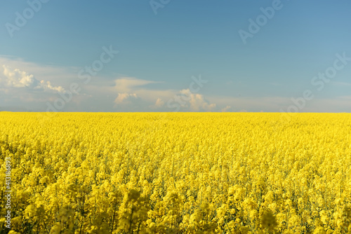 Obraz premium Bright blooming rapeseed field and blue sky. blooming field on a sunny day.