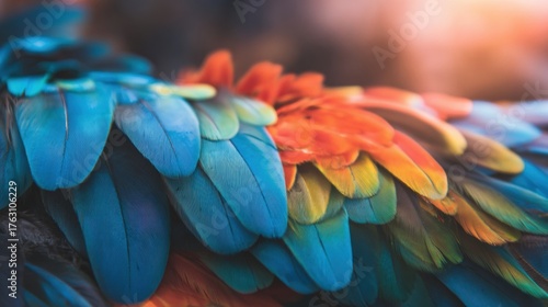 © tashechka, Fototapeta premium Bright blue and orange feathers of a macaw in natural light setting