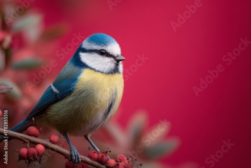 © Vitalii Shkurko, Fototapeta premium Bright Blue and Yellow Bird Perched on Branch With Red Berries in Soft Background