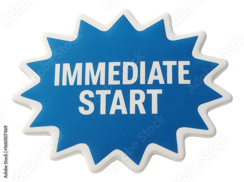 Fototapeta premium Bright blue burst sticker with IMMEDIATE START offer in bold lettering, attention-grabbing retail promotion on transparent background.
