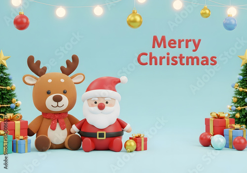 © Micro, Fototapeta premium Bright Blue Christmas Background with Santa, Reindeer, and Sparkling Trees