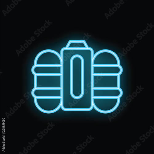 Fototapeta premium Bright blue neon icon of an oxygen tank is glowing against a black background