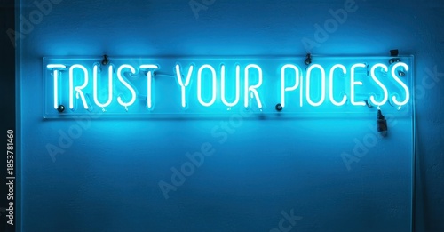 © antishock, Fototapeta premium Bright blue neon sign displays positive message. Wall background provides contrast. Simple, motivational interior design element.