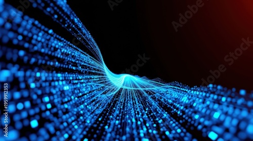Fototapeta premium Bright blue particles flow toward viewer. Dark background creates depth,...