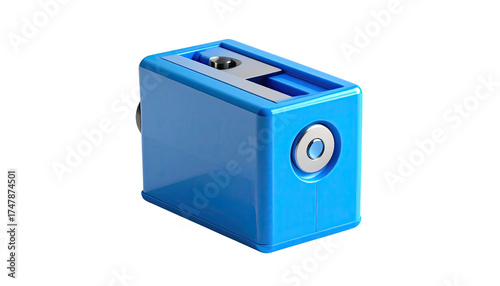 © Pallu, Obraz premium Bright blue rectangular device with silver blade slot for sharpening writing utensils