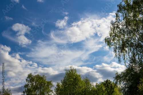 Fototapeta premium Bright blue sky featuring white, fluffy and wispy clouds. Green tree foliage...