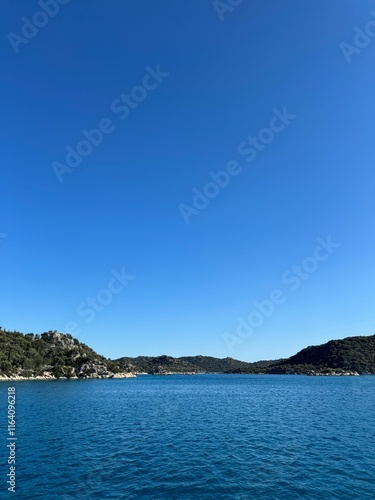 © Ангелина, Fototapeta premium Bright blue sky over calm waters on a sunny day near scenic coast