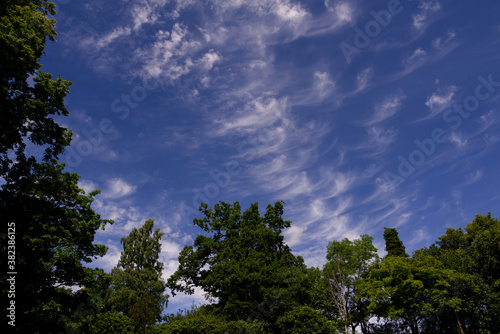 Obraz premium bright blue sky, white wispy clouds with trees