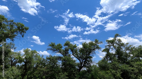 Obraz premium Bright Blue Sky with Clouds and Greenery / 青空と白い雲と木々の緑