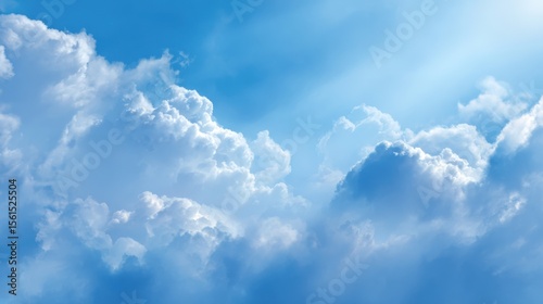 Naklejka premium Bright blue sky with fluffy white clouds and radiant sunlight shining through.
