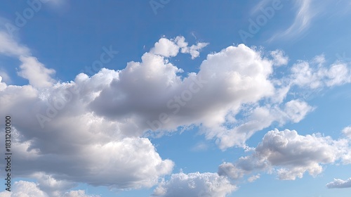 © 96, Fototapeta premium Bright Blue Sky with Fluffy White Clouds Illuminated by Natural Light in a Serene Atmosphere