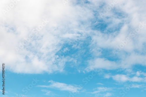 Fototapeta premium Bright blue sky with fluffy white clouds visible during a sunny day in early afternoon