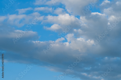 Fototapeta premium Bright blue sky with white fluffy clouds and bright sunlight.