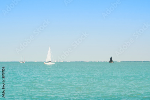 © Victoria, Fototapeta premium Bright blue transparent lake river water with white and black yachts at the horizon on sunny summer day.