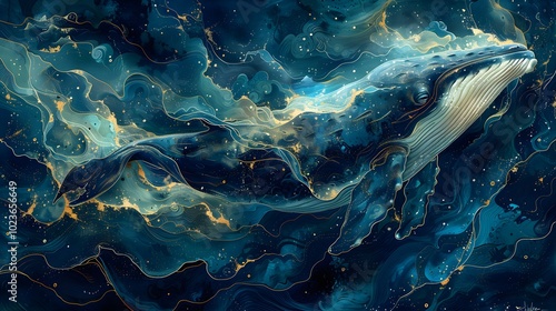 © StarStockArt, Fototapeta premium Bright blue whale swimming in a sea of swirle. AI generated