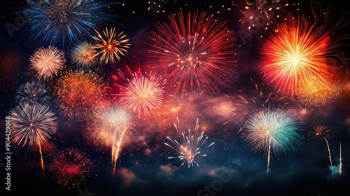 Naklejka premium Bright bursts of fireworks against a dark backdrop, Vibrant explosion of colors in the night sky.