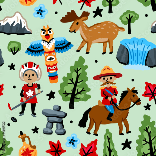 © Pictulandra, Fototapeta premium Bright cheerful children seamless vector pattern with symbols of Canada. American Indian, maple leaf, indian totem, mounted police. Alaska landmarks. Childish Forest travel background. North America