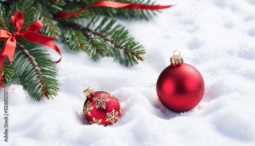 Obraz premium Bright Christmas Holidays background with Xmas ornament on snow