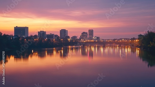 © adobestocker1, Fototapeta premium Bright city skyline during golden hour, with reflections in a calm river