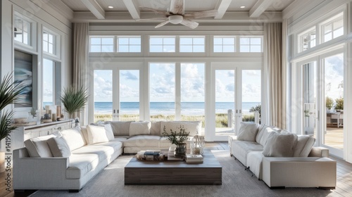 © Mas, Naklejka premium Bright coastal living room with ocean view and decor