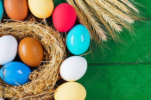 © RomanWhale studio, Fototapeta premium Bright colored dyed eggs on wooden table. Happy Easter eggs card