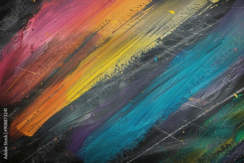 Obraz premium Bright, colorful brushstrokes decorate a dark green chalkboard, showcasing...