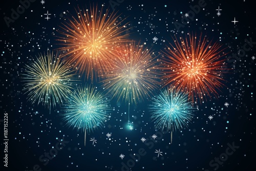 © nsit0108, Fototapeta premium Bright colorful fireworks exploding in the night sky with stars and snowflakes during a celebration