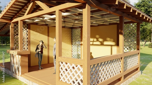 Fototapeta premium Bright, colorful illustration, picture of a wooden gazebo for relaxing in a...