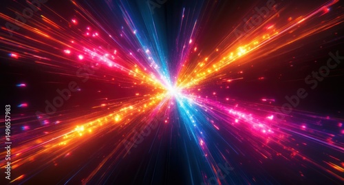 Fototapeta premium Bright colorful light beams and particles radiating outward from a central...