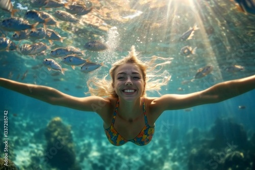 © G - Sto Xet, Fototapeta premium Bright commercial style image. A gorgeous and sexy happy caucasian young woman with blond hair with a happy face snorkeling among the corals. A dense school of silver fish swims next to her.