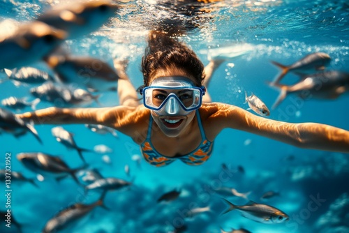 © G - Sto Xet, Naklejka premium Bright commercial style image. Stunning coral reef close-up. Coastal marine reserve visit. Water activity for tourists. Serene ocean escape. A dense school of silver fish swims next to her.