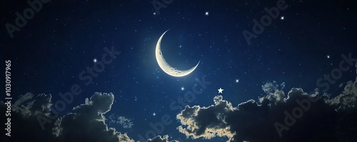 © Denys, Fototapeta premium Bright crescent moon shines through dark clouds, casting a soft glow in the starry night sky, creating a tranquil and heavenly scene