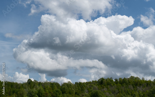 Fototapeta premium Bright cumulus clouds above forest canopies, soft fluffy clouds
