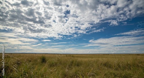 Fototapeta premium Bright daylight savanna scene with thriving green grass and a textured sky full of clouds