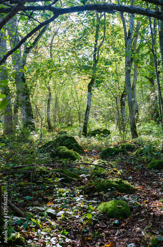 Obraz premium Bright deciduous forest with mossy rocks on the ground