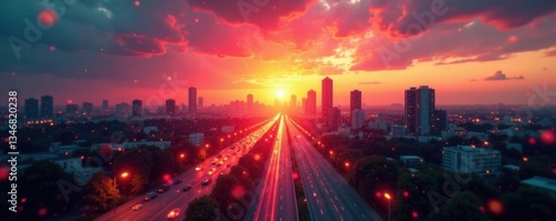 © Ton, Fototapeta premium Bright dot explosion on urban cityscape at sunset, bold patterns, sunset