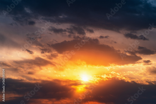 Obraz premium Bright dramatic sunset sky background. Beautiful colorful cloudscape with sun...