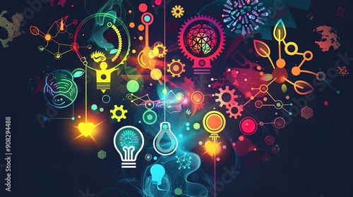 Fototapeta premium "Bright educational icons on a dark background, knowledge explosion,