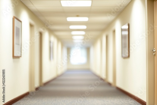 Obraz premium Bright empty hallway with soft lighting, blurred perspective, and framed art...