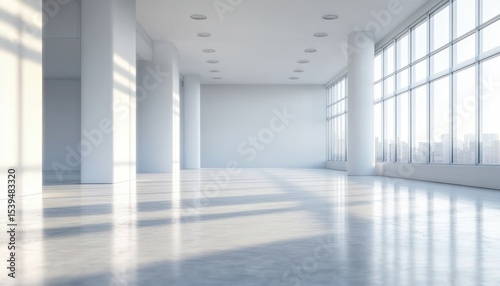 Obraz premium Bright empty modern room with large floor-to-ceiling windows, white walls, multiple pillars, and shiny floor reflecting soft natural light