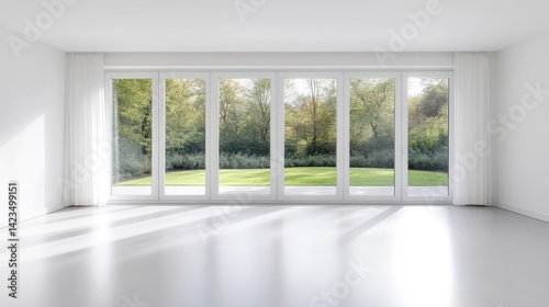 Obraz premium Bright, empty room with large windows showcasing a tranquil garden