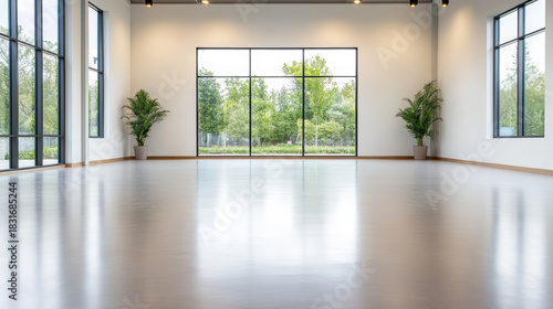 Fototapeta premium Bright empty studio with large windows and potted plants reflecting on polished floor