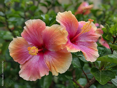 © Mitu321, Fototapeta premium Bright exotic hibiscus flowers with lush greenery